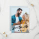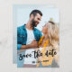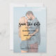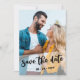 Double sided save the date with two full bleed portrait photos of the happy couple. The photo on the front has a translucent overlay, cut into a geometric angle and hand lettered with "save the date" in a bouncy brush script. The photo on the back has a full faux vellum style overlay to hold your names, wedding date and any additional information you wish to provide at this stage.