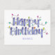 Hand lettered, hand painted Happy Birthday message with a string of lights draped around it. On the reverse is a special message which would be suitable for several recipients.