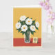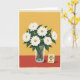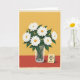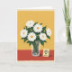 This card shows an illustrated still life of a full bouquet of white, many-petaled flowers with sunny yellow centers, nestled among rich green leaves 🌼. The blooms sit in a clear glass vase where the pale green stems can be seen through the water, adding a quiet, intimate touch. Everything rests on a deep red tabletop that feels like a cozy place set aside for someone special ❤️. Behind it, a glowing golden-yellow background wraps the scene in warmth, like late-afternoon light. A soft, lightly speckled texture across the image gives the artwork a gentle, cared-for look, as if the moment has been held onto. On the right side of the vase, a small cream folded note card stands upright, angled slightly toward the flowers like it was placed there with affection. The message is written in small black lettering centered on the front of the note, drawing the eye without overpowering the bouquet. The note sits just to the right of the vase on the red surface, with its pale edges clearly outlined against the golden background.