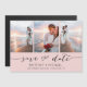 Pick the best pictures from your engagement shoot or your favorite pictures of the two of you for this perfect save the date. The words save the date are handwritten to give a personal feel to the card. The front has 3 images and the back has a large image with a white filter on top.
