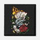 Original vector art of a hand holding playing cards that are on fire. With gold coins, dice, 8 Ball, Ribbon and a rose.