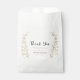 This whimsical wedding favor bag has a white background with customizable black and gold typography and hand-painted gold leaves and flowers.