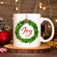 Celebrate the joy of the holiday season with our festive Joyful Wreath coffee mug. The Christmas mug features a green watercolor wreath hung by a red ribbon with "Joy" in a red script.