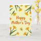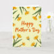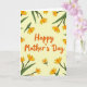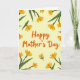 This greeting card features the words “Happy Mother’s Day” centered in a rich russet-orange lettering that stands out warmly against a soft lemon-yellow background ❤️. Around the edges, stylized flowers with golden-yellow petals and slim green stems form a loose border, like a spring wreath gently circling the message. The blossoms are spaced with breathing room, giving the layout an easy, friendly look rather than feeling crowded. Subtle shading in the petals and leaves adds a brushed, painted texture that feels tender and caring, as if arranged with someone special in mind. The main text sits in the middle of the page, while the floral details stay mostly along the perimeter, guiding the eye back to the greeting. A few small leaf clusters lean inward toward the center, creating a quiet sense of closeness and affection 🌼. The flowers show golden petals with soft highlights, paired with slender green stems and scattered leaves against the pale yellow field.