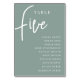 Simple and chic table number cards in Eucalyptus Green and white make an elegant statement at your wedding or event. Design features "table [number]" in an eyecatching mix of classic serif and handwritten script lettering, with individual guest names beneath. Design repeats on both sides. Individually numbered cards sold separately; order each table number individually from our collection.