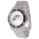 Has heft and feel of expensive stainless steel quartz watches. Good band with safety catch. I removed links, which is easy because engraved arrows show direction to push the linking pins. As always by this seller, the image (a railroad logo) is a perfect reproduction of my emailed image, and is precisely spaced and aligned.