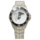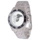 Has heft and feel of expensive stainless steel quartz watches. Good band with safety catch. I removed links, which is easy because engraved arrows show direction to push the linking pins. As always by this seller, the image (a railroad logo) is a perfect reproduction of my emailed image, and is precisely spaced and aligned.