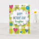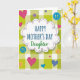 This card features a large, irregular white speech-bubble shape at the center, edged with a dashed border that alternates blue and deep red like tiny stitches. Inside it, “HAPPY MOTHER’S DAY” sits prominently in bright blue, with “Daughter” placed just beneath in soft green, giving the lettering a gentle, affectionate contrast ❤️. The background is a lime-green and white gingham grid that feels bright and friendly, like a sunny kitchen tablecloth. Around the main message, scattered hearts in hot pink include a dotted animal-print texture, while other hearts appear in solid and patterned blues, suggesting a sweet back-and-forth between close family members. Small round accents resembling buttons and badges add cozy detail, including a vivid blue circle with four yellow stitch-like holes that hints at something lovingly mended. A smaller blue badge carries simple abstract marks, and a tiny yellow smiling face peeks out like a little wink of warmth 🌼. The overall layout keeps the text centered while the hearts and circles orbit loosely across the green-and-white checks, with the pink hearts and blue button shapes standing out crisply against the background.