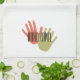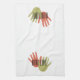Need a towel for drying hands in the kitchen? There's no mistaking what this towel should be used for. Each end has a terra cotta and olive set of hand prints with the words "hand towel" printed across them. Hang it on the fridge or near the sink where it's sure to be seen and used for the purpose it is intended. Also available in teal and red