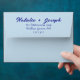 A retro modern hand written bright colorful wedding envelope. Which features bold bride and groom's names in navy color. And personalized return address . On simple pale light blue vintage color background. Which suits the whole wedding suite.
