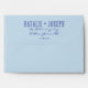 A retro modern hand written bright colorful wedding envelope. Which features bold bride and groom's names in navy color. And personalized return address . On simple pale light blue vintage color background. Which suits the whole wedding suite.