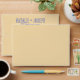 A retro modern hand written bright colorful wedding envelope. Which features bold bride and groom's names in blue color. And personalized return address . On simple pale orange sandy vintage color background. Which suits the whole wedding suite.