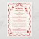 Add a charming touch to your wedding table setting with this hand-illustrated, retro-inspired menu, a delightful mix of unique artistry and whimsical design. This menu card features a wavy frame and a hand-drawn bow at the top, capturing the nostalgia of vintage stationery while keeping it fresh and trendy. With playful, doodle-like illustrations and hand-lettered text, each detail feels crafted by hand, creating a memorable keepsake for your guests as they enjoy the carefully curated meal you’ve planned for your special day.