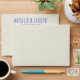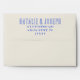 A retro modern hand written bright colorful wedding envelope. Which features bold bride and groom's names in blue color. And personalized return address . On simple cream beige color background. Which suits the whole wedding suite.