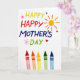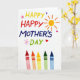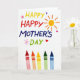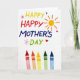 Designed with a bright white background, this card centers on a large, multi-colored message that stretches across the upper two-thirds, with the letters arranged in a lively, slightly uneven way like eager marker strokes. The text uses sunny yellow, red, deep blue, and green, and the placement feels like a cheerful declaration meant for someone close ❤️. In the upper right, a round sun shape glows with orange rays, adding a warm, friendly glow to the scene. Small hearts in pink, purple, and deep red float around the wording, suggesting a tender, affectionate mood between giver and receiver. Tiny pink starburst marks dot the space near the letters, adding extra sparkle without crowding the message. Along the bottom third, five upright wax sticks stand in a row with their tips pointing up, colored red, orange, yellow, green, and blue, with faint texture lines like well-used art tools 🌼. The lighting stays soft and even, and the crisp white space makes every color and little heart shape stand out clearly.