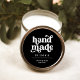 These trendy, boho black small business packaging labels feature white retro typography, on a dark black background. The text says "handmade", and there is room for your name or your company name, and the name of your product. A look that is both professional and stylish, and perfect for any type of product, such as candles, apparel, crafts, and ceramics.