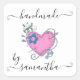 These custom stickers for crafters and artisan makers are easy to personalize and add to handmade gifts or retail products. The design features a country style love heart stiched around the edge with a sewing needle, buttons and embroidered flower. Handmade by [your name] is lettered in elegant handwritten script typography.