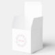 An elegant "Handmade by" gift box in white and pink, with a sewing button design.