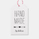 Rustic brown kraft gift tags or hang tags for your handmade, artisan, or craft business feature two lines of custom text on the front in handwritten style block and script lettering, bisected by a black heart and arrow illustration. Add five lines of custom text to the reverse side in matching fonts. Includes three social media icons and a field for your username.