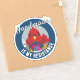“Handmade Is My Resistance” round badge-style sticker features a bold red cardinal knitting in a blue, retro-modern, mid-century–inspired design.