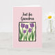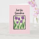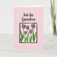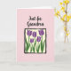 This card features a soft pale pink background that sets a gentle, affectionate mood ❤️. Near the top, a short dedication appears in black lettering, centered and easy to spot. Below it sits a slightly uneven, black-outlined rectangle that feels like a cozy frame for a small garden scene. Inside, five stylized tulip-like flowers in deep purple stand close together, their petals edged with thin white lines that make them look carefully traced. The flowers lean toward one another as if sharing a quiet, friendly closeness, while green stems and leaves rise from the bottom. Behind the bouquet, a calm light yellow fill creates a sunny, caring backdrop 🌼. The dark border and lettering contrast softly with the pastel field, drawing your eye from the message down to the blooms. The rectangular panel’s black outline looks gently hand-drawn, with small natural wobbles around the edges.