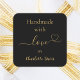 A classic black background, golden text. Personalize and add your name. With the text: Handmade with love, by + a small heart.