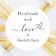 A stylish white background, black text. Personalize and add your name. With the text: Handmade with love, by + a small heart.