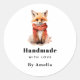 Stickers which say "Handmade with Love" with an illustration of a reddish orange fox pup. A subtle smile on his face. Wearing a nice red scarf for warmth.
