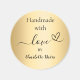 A faux gold looking background, black text. Personalize and add your name. With the text: Handmade with love, by + a small heart.