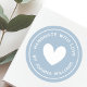 Round stickers with a white heart surrounded by the text "handmade with love" and your name or other custom text on a light dusty blue background. Use as stickers for gifts and favors, product packaging etc.