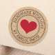 Stickers with a red heart and text the "Handmade with love" and custom name on a printed Kraft paper look background. Use as envelope seals, stickers for gifts and favours, product packaging etc