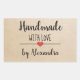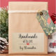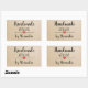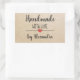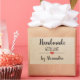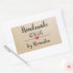 Modern "handmade with love" sticker with a black font on a cardboard background embellished by a cute red heart. Customize text.