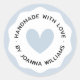 Round stickers featuring a light dusty blue heart surrounded by the text "handmade with love" and your name or other custom text with a light dusty blue, wavy border. Use as stickers for gifts and favors, product packaging etc.