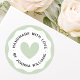 Round stickers featuring a light sage green heart surrounded by the text "handmade with love" and your name or other custom text with a light sage green, wavy border. Use as stickers for gifts and favors, product packaging etc.