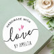 Round stickers with pink hearts, the text "handmade with love" and your custom name on a white or any color background. The word "love" is written in an elegant calligraphy script font. Use as envelope seals, stickers for gifts and favors, product packaging etc. Follow us on Facebook: @businessstationery for more products, news, sales and more.
