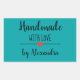 Modern "handmade with love" sticker with a black font on a teal background embellished by a cute red heart. Customize text.