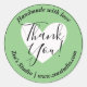 Round stickers with a white heart, the text "handmade with love" and your custom name and website or other custom text on an eco green background. The words "Thank You!" are written in an elegant calligraphy script. Use as envelope seals, stickers for gifts and favors, or any other product packaging.