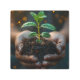 Hands cradle rich, dark soil from which a vibrant young plant emerges, its fresh green leaves unfurling toward soft golden light. Tiny dew drops glisten on the foliage and earth, while warm amber bokeh orbs float in the blurred background like distant fireflies or embers of hope. Gentle rim lighting outlines the fingers and soil edges, creating an intimate, almost sacred moment of nurturing and new life. The composition radiates quiet strength, renewal, environmental care, and the simple miracle of growth—evoking themes of sustainability, mindfulness, beginnings, and the fragile beauty of nature.