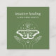 Elegant business cards for psychotherapy studio, energy healing, life guidance, yoga or massage studios, massage therapy, meditation teacher, natural health counselor, spas or wellness professionals feature a white illustration of a two opened hands creating energy with a spiritual moth a third eye moon and stars in solid moss green color background.