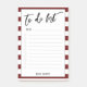 This fun design features a white rectangle surrounded by a dark burgundy red and white striped border. I've added a white striped overlay and the background can be changed to any color you like. I've used a casual handwritten font to create a graphic that reads "to do list", and angled it quite large at the top. The word "Date" with a light line appears below the header, and beneath that, ten lines with square check boxes to the left. Your name appears at the bottom in an all caps, serif font that can be changed if you wish. There is an unlined version, as well.