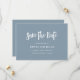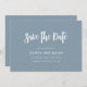 These elegant, dusty blue wedding save the date cards feature edgy modern white script typography for a casual yet urban style.