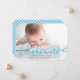 Handwritten Modern Baby Birth Photo Announcement Card with Blue Script. Sparkle & Glitter ©. More styles available in our shop. Typography overlay with the word "welcome" in a handwriting script font. Elegant and versatile design you can customize for a baby boy, or twins, new baby announcement. Blue and white stripes or lines pattern on the back.