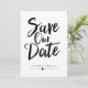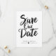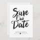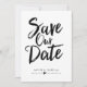 This design features the words "save the date" in bold black handwritten script. Couple's names and wedding details are displayed below and can be customized.