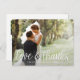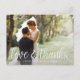 A modern photo thank you postcard designed to accommodate your favorite full bleed horizontal or landscape oriented wedding photo. "Love and thanks" appears along the bottom as a white text overlay in handwritten style script. Personalize with your names and/or wedding date beneath.