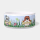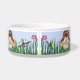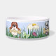 Cute whimsical puppy dogs holding onto big dog bones with fun butterfly, and dragonfly fluttering around the tall grass and flower garden setting. Name tag area at front of dog bowl is ready for you to customize. Matching Dog Treat Jar available in my store.