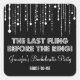 It's the last fling before the ring so celebrate in style and get the girls together with this fun bachelorette party sticker. A row of sparkling fairy lights hang from the top of this sticker with the text "The last fling before the ring!" underneath. Add a name, event, wedding party role or any other information against the rich black background. Available in alternate colors with matching products.