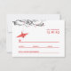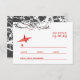 Origami red paper crane hanging on branches against a white background. The back design is in matching reverse colors. A double sided wedding RSVP card.