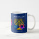 Modern, stylish HANUKKAH BLESSINGS coffee mug, designed with large menorah (hanukkiyah) at the center, and blue dreidel and colorful Star of David on either side. Text reads HANUKKAH BLESSINGS and FROM OUR HOME TO YOURS. Both of these are CUSTOMIZABLE so you can customize with your own message, add your name or adapt it as a corporate favor gift. The design is repeated on the back, and in the middle there is a CUSTOMIZABLE MONOGRAM inside another colorful Star of David. This would make a great gift during Hanukkah season, and for birthdays and throughout the year when customized. Choose from a wide selection of Hanukkah cards and gifts designed by Berean Designs.