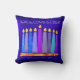 “Peace, love & light.” A playful, modern, artsy illustration of boho pattern candles in a menorah helps you usher in the holiday of Hanukkah. Assorted blue candles with colorful faux foil patterns overlay a rich, deep blue textured background. Faux hot pink purple pattern foil on a cornflower blue background for the reverse side. Feel the warmth and joy of the holiday season whenever you relax on this stunning, colorful Hanukkah throw pillow. Matching cards, envelopes, stickers, tote bags, wrapping paper, serving trays, home décor, and more are also available. Makes a great gift for someone special!