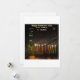 a Hanukkah card featuring a nighttime cityscape with a brightly lit menorah in the foreground. The menorah has nine candles, all lit, symbolizing the eight nights of Hanukkah. The card includes the message "Happy, Healthy Hanukkah 2024" and you can personalize the text!